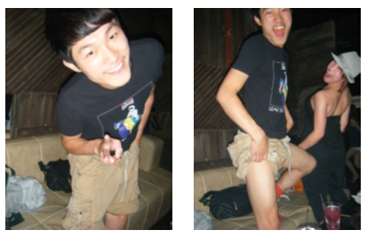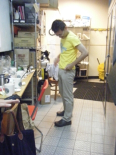 於是已經入場的ray只好脫下他下半身的裝扮,換給在外頭等候的小米