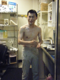 最後老闆只好把衣服脫下來洗(印象中是白色襯衫耶,整件毀了)